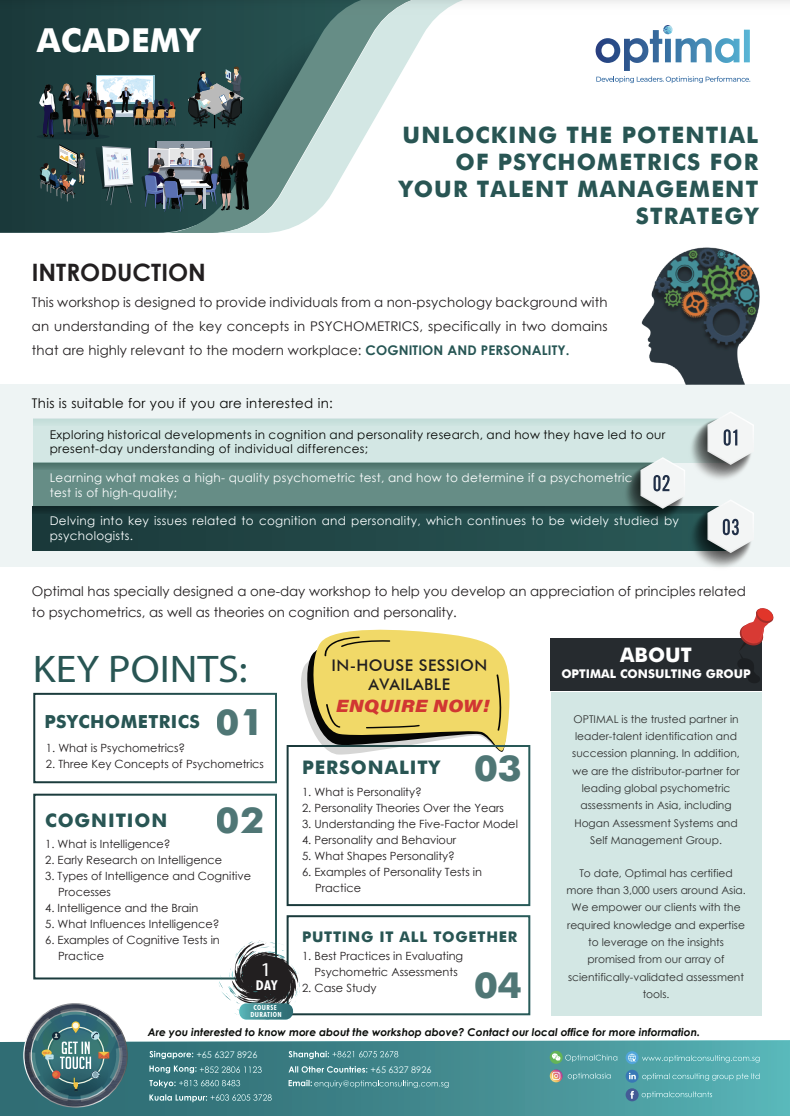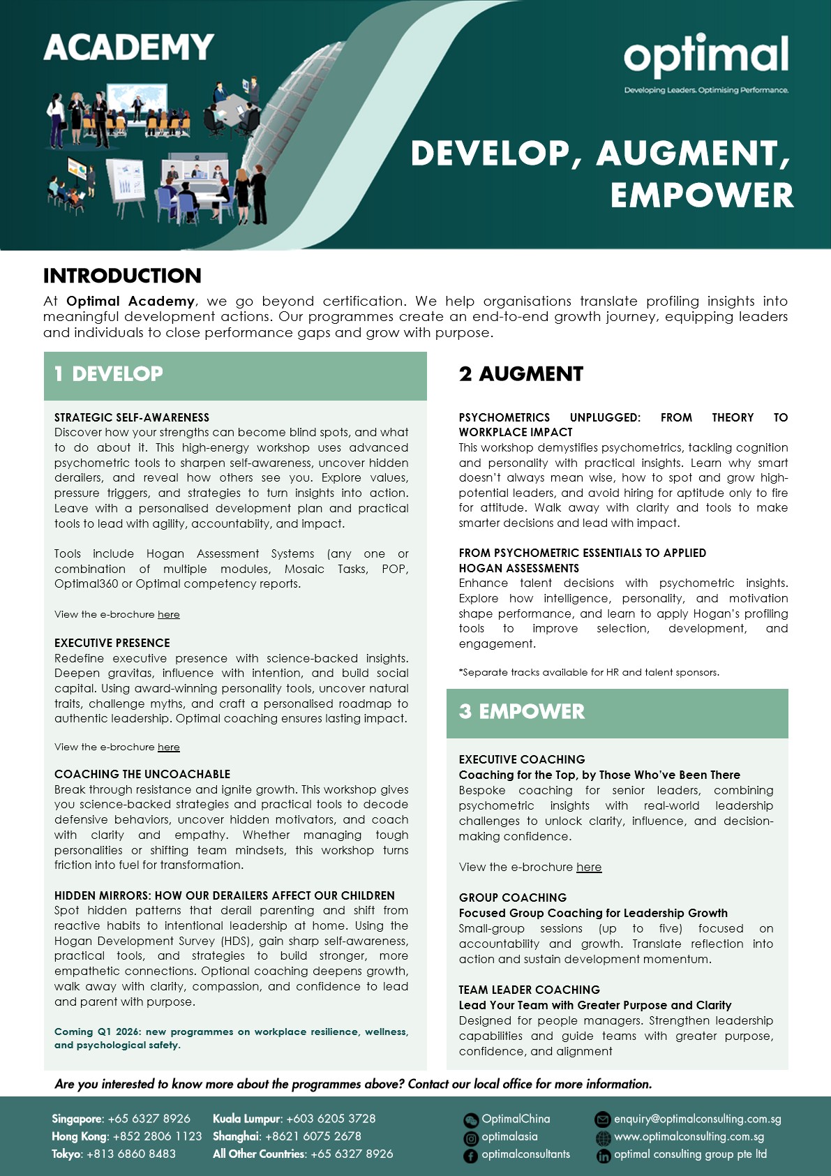 Academy by admin Brochures 28/03/2023 Develop, Augment & Empower Unlocking the Potential of Psychometrics for Your Talent Management Strategy Strategic Self-Awareness Executive Presence Assessment-Based Coaching Hogan Assessments Certification 2026