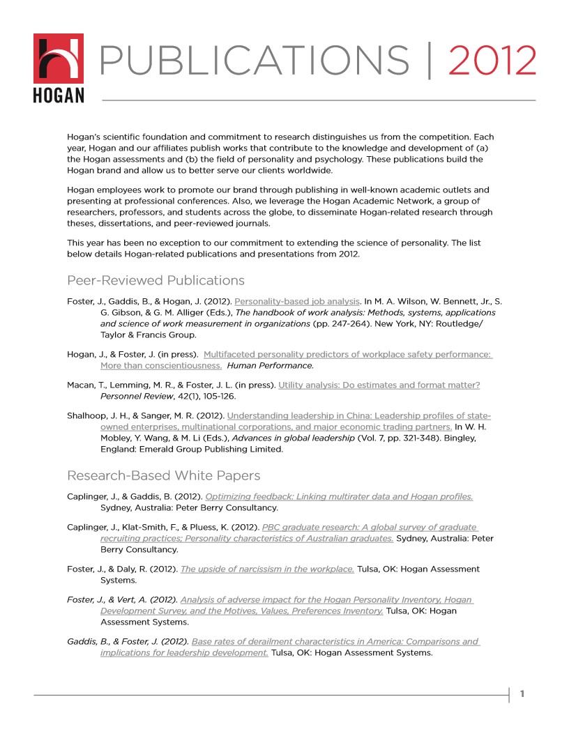 Hogan Assessments prides itself as being the leader in the Science of Personality by employing one of the industry’s largest data science teams of Ph.D. and Masters-level psychologists specializing in industrial and organizational psychology, research methods, personality, and statistics. Find more Hogan’s publications here.